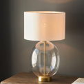 The oval-shaped design allows it to complement various interior styles, from minimalist office settings to residential reading areas. The brass and glass construction provides durability while creating visual interest through the contrast of metallic and transparent materials. The touch control system eliminates the need for traditional switches, allowing users to operate the lamp through simple contact with designated areas on its surface.
