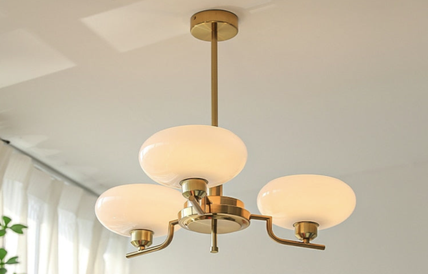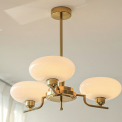 Opal glass shades suspended by brass arms are also characteristic of pendant lights and chandeliers. Here, the arms often serve to position multiple shades around a central stem or canopy.